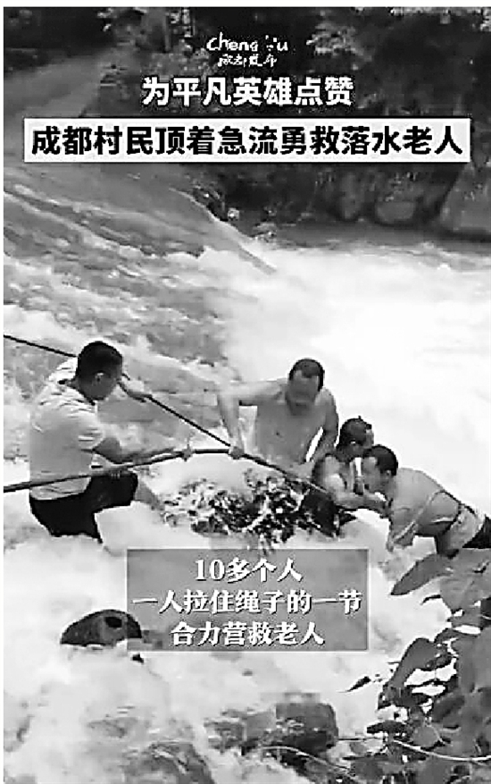 近日,四川成都大邑,一位老人被困湍急的河流中,此处为一下坡河道,河水流速极快。危急时刻,数名身着红马褂的社区工作人员和当地村民出现在岸边,10多个人一人拉住绳子的一节,合力营救老人。最终,众人合力将老人救上了岸。