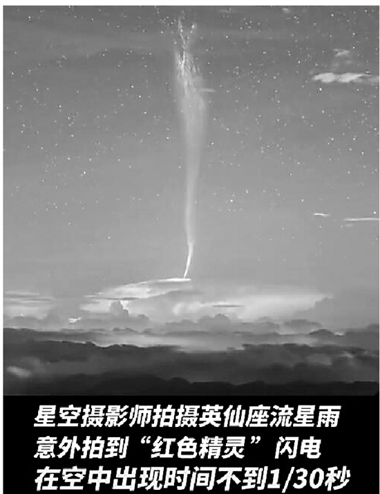 近日,广东梅州,星空摄影师拍摄英仙座流星雨时意外拍到“红色精灵”闪电,在空中出现时间不到1/30秒。网友:闪电原来可以这么漂亮。