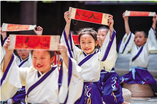 8月17日,长兴县李家巷镇在文化礼堂为即将进入小学学习的孩子举办“开笔破蒙 启智人生”开蒙礼活动,老教师带领孩子们参与朱砂启智、开笔描红、击鼓明志等仪式,品味传统文化古韵,感悟尊师孝亲之礼。 谭云俸 摄