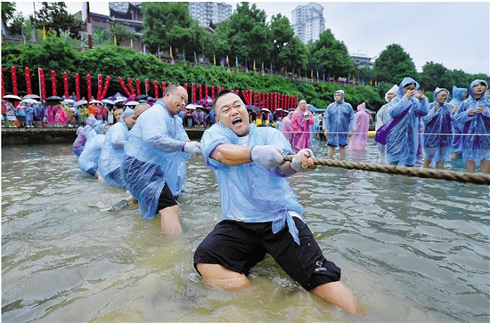 近日,在湖北省恩施土家族苗族自治州宣恩县仙山贡水旅游区的贡水河中,近千名居民和游客组成60余支拔河队在河中开展趣味拔河比赛,感受快乐与清凉。