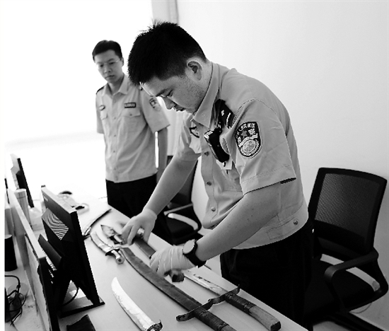 夏季治安打击整治行动开展以来,临海市公安局加大关于缉枪治爆、管制器具等法律法规的宣传力度,消除治安隐患。近日,杜桥镇居民老周在即将拆迁的破房子里发现8把管制刀具,立即送到派出所。图为民警正在清点管制刀具。