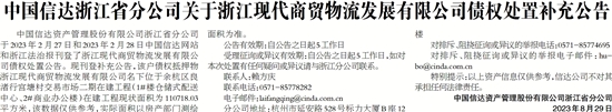 中国信达浙江省分公司关于浙江现代商贸物流发展有限公司债权处置补充公告