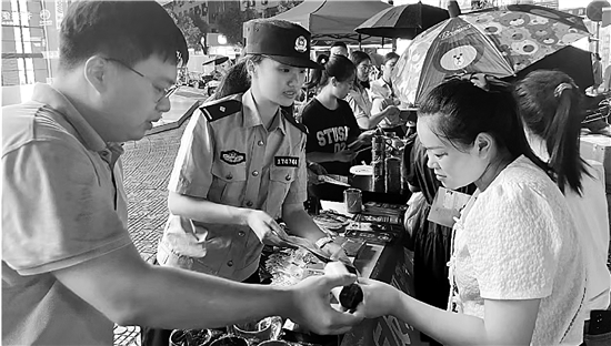 夏季治安打击整治行动开展以来,台州市公安局黄岩分局积极开展安全防范活动,通过直播、“摆地摊”等形式向群众宣传反诈、防溺水、反恐、禁毒等安全知识。图为近日新前派出所民警在辖区夜市“摆摊”宣传。