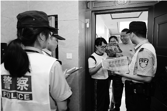 “夏季行动”期间,温州龙湾公安全警出战,以“扫楼”形式挨家挨户开展反诈宣传。图为近日民辅警上门向群众发放反诈宣传资料、揭秘诈骗手段、教授防范技能。 通讯员 管文博 摄