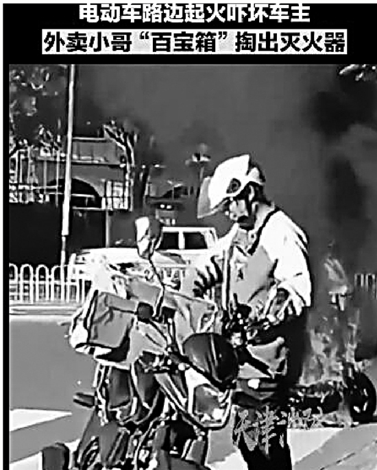日前,天津蓟州区路边一辆电动车起火,车主紧急报警。就在这时,一名外卖小哥恰巧路过,从外卖箱中淡定拿出灭火器,并在扑灭明火后潇洒离去。此后,消防员到场用水枪对隐藏火势进行了处置,确认无复燃隐患后归队。