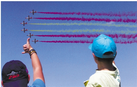 9月2日,人们在希腊塔纳格拉空军基地举行的雅典飞行周上观看西班牙飞行表演队的表演。
