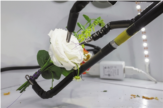 | 2023年中国国际服务贸易交易会于9月2日至9月6日在北京举办。展会上不少中国企业走在行业技术前沿,从中国制造向中国“智”造发展升级。在服贸会首钢园区北京友谊医院展台,图迈单臂腔镜手术机器人用手术线打结。 新华社 张玉薇 摄 |