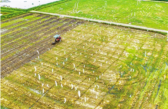 9月7日,浙江省温岭市石桥头镇土坦新村,农民驾驶农机翻耕整地,成群的白鹭跟随农机觅食、飞舞(无人机照片)。