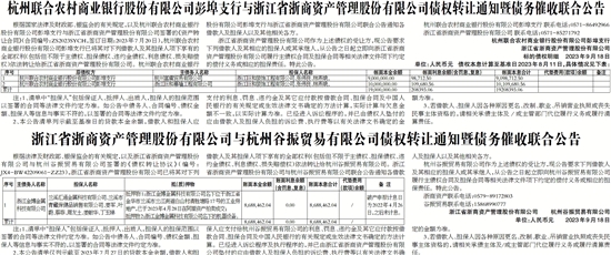 根据法律及财政部、银保监会的有关规定,以及浙江省浙商资产管理股份有限公司与杭州谷振贸易有限公司签署的《债权转让协议》(编号:JX4-BW42209061-ZZ23),浙江省浙商资产管理股份有限公司已将其对下列借款人及其担保人项下享有的全部权利(包括但不限于主债权、担保债权、违约金债权、利息债权、损失赔偿权)依法转让给杭州谷振贸易有限公司。浙江省浙商资产管理股份有限公司与杭州谷振贸易有限公司联合公告通知各借款人及担保人以及其他相关各方。