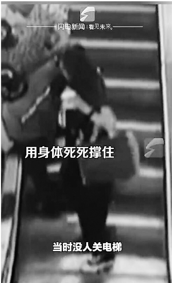 老人抱婴儿乘扶梯险摔倒
