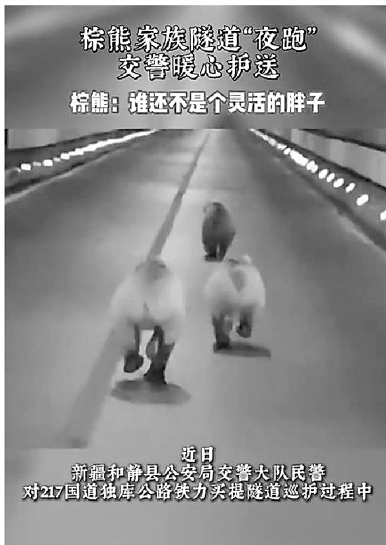 近日,新疆和静县交警在巡护一隧道时,发现3头棕熊在隧道内奔跑。为防止发生事故,警车减速行驶护送棕熊安全通过隧道。警方提醒:棕熊具有攻击性,路遇棕熊请勿靠近、投食、近距离拍摄。