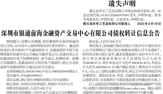 以上全部信息详情请登录深圳市银通前海金融资产交易中心有限公司相关信息披露网站www.ytfae.com。地址:深圳市福田区深南大道2016号招商银行深圳分行大厦33楼。