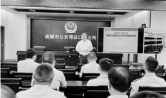 近日,诸暨店口派出所开展了心理健康知识讲座。专家以《新时代民警压力应对情绪管理》为题,结合公安工作特殊性,向民辅警介绍了如何正确释放心理压力、日常生活中调节压力的方法等,帮助民辅警保持良好的精神状态和高昂的斗志。 通讯员 杨晶