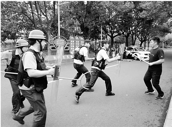 近日,天台县公安局联合县外国语学校开展防暴处突演练,以不明身份人员入侵校园袭击学生为模拟场景,辖区派出所快速反应,迅速将“不法分子”控制,成功解除危机。此次演练警校联动、反应快速,整个处置过程紧张有序,进一步提高了处置水平。