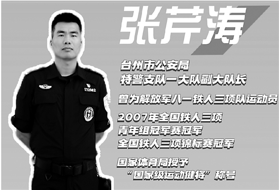 台州市公安局特警支队一大队副大队长张芹涛,曾经是解放军八一铁人三项队运动员。一米八的高个子,身材魁梧,笑起来却很腼腆,他说:“我算是半路出家,‘铁三’可让我吃了不少的苦头。”