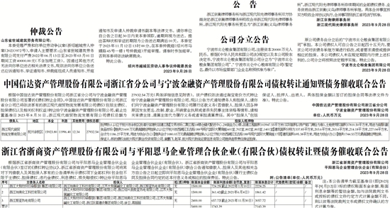 根据浙江省浙商资产管理股份有限公司与平阳恩马企业管理合伙企业(有限合伙)签订的《债权转让协议》,浙江省浙商资产管理股份有限公司将其对下列借款人及其担保人享有的公告清单所示债权项下全部权利(包含但不限于主债权、担保债权、违约金债权、利息债权、损失赔偿权)转让给平阳恩马企业管理合伙企业(有限合伙)。浙江省浙商资产管理股份有限公司与平阳恩马企业管理合伙企业(有限合伙)联合公告通知借款人、担保人及其他相关各方自公告之日起立即向平阳恩马企业管理合伙企业(有限合伙)履行主债权合同及担保合同约定的还本付息义务或相应的担保责任。特此公告。
