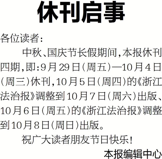 中秋、国庆节长假期间,本报休刊四期,即:9月29日(周五)—10月4日(周三)休刊,10月5日(周四)的《浙江法治报》调整到10月7日(周六)出版、10月6日(周五)的《浙江法治报》调整到10月8日(周日)出版。
