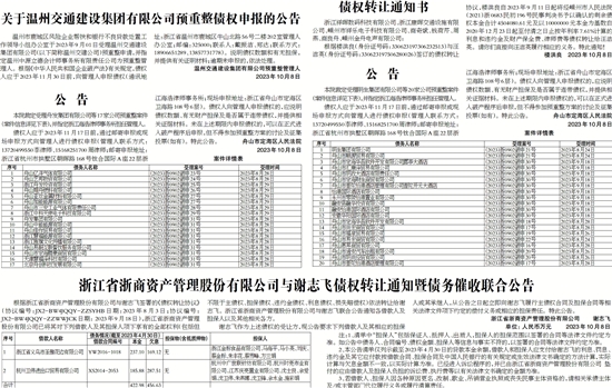 根据浙江省浙商资产管理股份有限公司与谢志飞签署的《债权转让协议》(协议编号:JX2-BW4JQQY-ZZSYHB日期:2023年8月3日;协议编号:JX2-BW4JQQY-ZZWWJCK日期: 2023年9月18日),浙江省浙商资产管理股份有限公司已将其对下列借款人及其担保人项下享有的全部权利(包括但不限于主债权、担保债权、违约金债权、利息债权、损失赔偿权)依法转让给谢志飞。浙江省浙商资产管理股份有限公司与谢志飞联合公告通知各借款人及担保人以及其他相关各方。