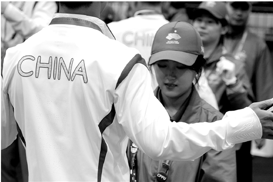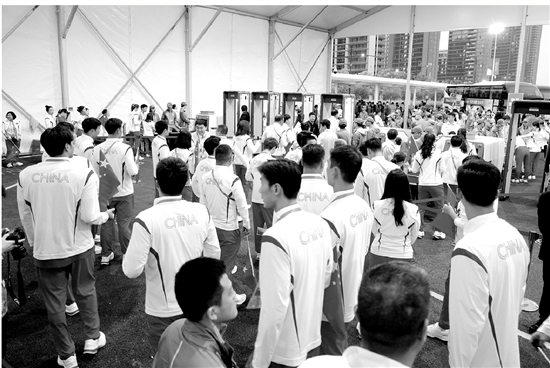 “前方就是安检口了,请大家把随身物品拿出来,配合我们的工作……”在距离安检口50米处的运动员通道中,安检工作就已经提前开始了。面对走过来的运动员们,几名安检人员反复提醒着。运动员们都很配合,提前掏出了放在口袋里的随身物品。