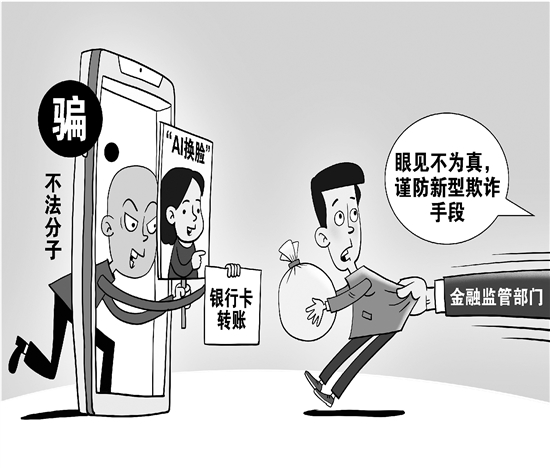 | “AI换脸”诈骗利用仿真技术冒充亲人、同事或公职人员声音相貌行骗,此类新型网络诈骗手段多样、门槛降低、辨别难度加大,常令公众放松警惕,短时间内造成较大损失。国家金融监督管理总局北京监管局近日发布风险提示:眼见不为真,谨防新型欺诈手段,提高打假维权本领,守护家人亲朋财产安全。 新华社 朱慧卿 作 |