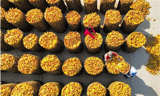 | 10月10日,河北省遵化市刘备寨乡尚庄屯村的农民将收获的玉米装入粮囤(无人机照片)。 金秋时节,在河北省遵化市刘备寨乡由丘陵坡地改造成的梯田中,农民抢抓农时收获玉米等秋粮。近年来,遵化市大力实施土地整治工程,将浅山丘陵坡地和荒草地改造成保水保肥的水平梯田,促进农业增效、农民增收。 新华社 杨世尧 摄 |