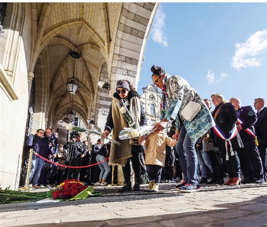 | 10月15日,在法国北部城市阿拉斯,人们为持刀袭击事件中的遇难者献上鲜花。 10月13日上午,法国北部城市阿拉斯一所高中发生持刀袭击事件,造成1名教师死亡、3人重伤。警方已逮捕包括行凶者在内的8人。据当地媒体报道,法国国家反恐检察院已对案件展开调查,犯罪嫌疑人面临“与恐怖主义行为有关的谋杀和企图谋杀”等多项指控。 新华社 法新 |