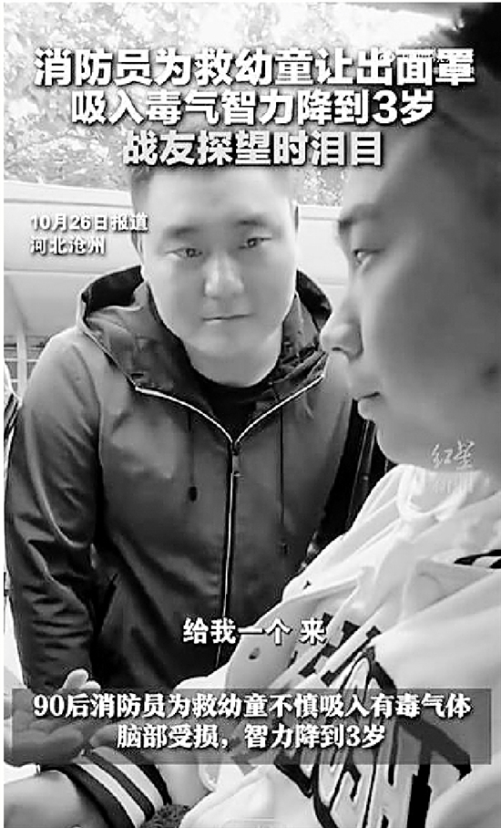 近日,一段消防员探望受伤战友满眼心疼的视频感动网友。今年3月,河北沧州,消防员库学辉救火时,因情况紧急,把自己的空气呼吸器面罩给被困幼童戴上。孩子成功获救,库学辉却因吸入混合气体中毒,智力倒退至3岁,失去自理能力。队友轮流帮他进行康复训练,妻子和12岁的儿子悉心照料,不离不弃。向消防员致敬,愿早日康复!