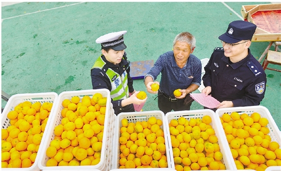 近日,三门县公安局花桥派出所开展送安全进橘园活动。民警利用橘农采收休息间隙,宣传反诈和交通安全知识,为橘农秋收保驾护航。 通讯员 林利军