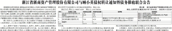 根据国家法律及财政部、银保监会的有关规定,以及浙江省浙商资产管理股份有限公司与顾小英签署的《债权转让协议》(编号:[12SX20200826001-2021001]),浙江省浙商资产管理股份有限公司已将其对公告清单中所列主体享有的全部权利(包括但不限于主债权、担保债权、违约金债权、利息债权、损失赔偿权)依法转让给顾小英,各债权对应的主合同以及担保合同项下的全部权利也依法转让给顾小英。浙江省浙商资产管理股份有限公司与顾小英联合公告通知各借款人及担保人以及其他相关各方。