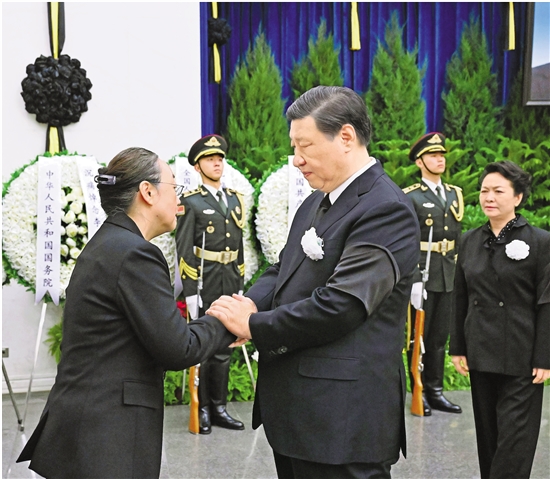 | 11月2日,李克强同志遗体在北京八宝山革命公墓火化。习近平、李强、赵乐际、王沪宁、蔡奇、丁薛祥、李希、韩正等前往八宝山送别,胡锦涛送花圈表示哀悼。这是习近平与李克强亲属握手,表示深切慰问。 新华社记者 谢环驰 摄 |