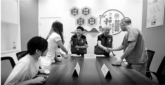 | 祥符街道矛盾调解中心,费大姐调解结束后与当事人握手 |