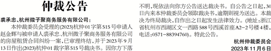 本仲裁委员会受理的(2023)杭仲01字第515号申请人赵金辉与被申请人裘承忠、杭州微子聚商务服务有限公司的房屋租赁合同纠纷一案,已审理终结,并于2023年9月13日作出(2023)杭仲01裁字第515号裁决书。因你方下落不明,现依法向你方公告送达裁决书。自公告之日起,30日内来本仲裁委员会领取裁决书,逾期则视为送达。本裁决为终局裁决,自作出之日起发生法律效力。(地址:浙江省杭州市西湖区文一西路588号西溪首座A2-2号楼4楼,电话:0571-88394760)。特此公告。