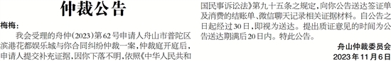 我会受理的舟仲(2023)第62号申请人舟山市普陀区滨港花都娱乐城与你合同纠纷仲裁一案,仲裁庭开庭后,申请人提交补充证据,因你下落不明,依照《中华人民共和国民事诉讼法》第九十五条之规定,向你公告送达签证单及消费的结账单、微信聊天记录相关证据材料。自公告之日起经过30日,即视为送达。提出质证意见的时间为公告送达期满后20日内。特此公告。