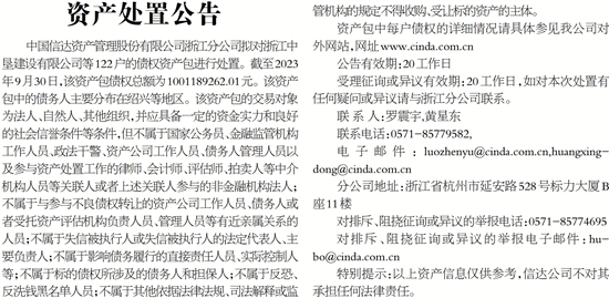 中国信达资产管理股份有限公司浙江分公司拟对浙江中垦建设有限公司等122户的债权资产包进行处置。截至2023年9月30日,该资产包债权总额为1001189262.01元。该资产包中的债务人主要分布在绍兴等地区。该资产包的交易对象为法人、自然人、其他组织,并应具备一定的资金实力和良好的社会信誉条件等条件,但不属于国家公务员、金融监管机构工作人员、政法干警、资产公司工作人员、债务人管理人员以及参与资产处置工作的律师、会计师、评估师、拍卖人等中介机构人员等关联人或者上述关联人参与的非金融机构法人;不属于与参与不良债权转让的资产公司工作人员、债务人或者受托资产评估机构负责人员、管理人员等有近亲属关系的人员;不属于失信被执行人或失信被执行人的法定代表人、主要负责人;不属于影响债务履行的直接责任人员、实际控制人等;不属于标的债权所涉及的债务人和担保人;不属于反恐、反洗钱黑名单人员;不属于其他依据法律法规、司法解释或监管机构的规定不得收购、受让标的资产的主体。