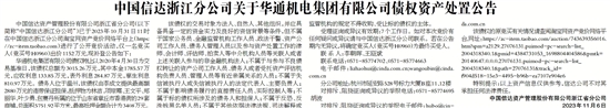 中国信达浙江分公司关于华通机电集团有限公司债权资产处置公告