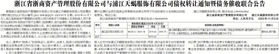 根据浙江省浙商资产管理股份有限公司与浦江天蝎服饰有限公司签署的《债权转让协议》(协议编号:JX2-BW4JQQY-ZZYTCY日期: 2023年10月7日),浙江省浙商资产管理股份有限公司已将其对下列借款人及其担保人项下享有的全部权利(包括但不限于主债权、担保债权、违约金债权、利息债权、损失赔偿权)依法转让给浦江天蝎服饰有限公司。浙江省浙商资产管理股份有限公司与浦江天蝎服饰有限公司联合公告通知各借款人及担保人以及其他相关各方。