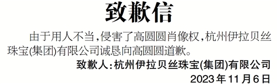 由于用人不当,侵害了高圆圆肖像权,杭州伊拉贝丝珠宝(集团)有限公司诚恳向高圆圆道歉。