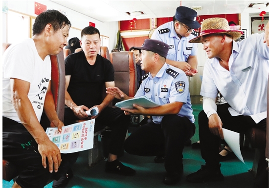 近日,玉环市公安局干江派出所在辖区轮渡船上开设“海上安全课堂”,对来往游客开展防诈等内容的平安宣传。