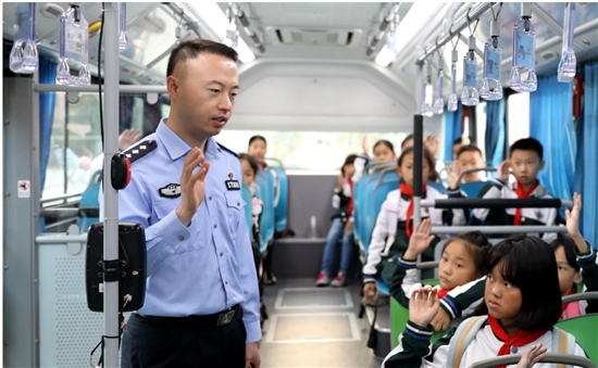 近日,临海市公安局小芝派出所民警登上小芝中心小学的校车,以互动问答的方式,给孩子们上了一堂安全课。 通讯员 叶明銮 摄