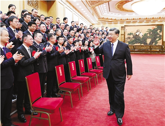 上午10时30分,习近平等来到人民大会堂东大厅,全场响起热烈掌声。习近平等向代表们挥手致意,同大家亲切交流并合影留念。