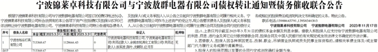 宁波锦莱卓科技有限公司与宁波敖群电器有限公司债权转让通知暨债务催收联合公告