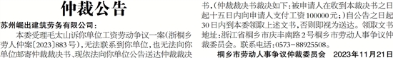 本委受理毛太山诉你单位工资劳动争议一案(浙桐乡劳人仲案〔2023〕883号),无法联系到你单位,也无法向你单位邮寄仲裁裁决书、现依法向你单位公告送达仲裁裁决书,(仲裁裁决书裁决如下:被申请人在收到本裁决书之日起十五日内向申请人支付工资100000元;)自公告之日起30日内到本委领取上述文书,否则即视为送达。领取文书地址:浙江省桐乡市庆丰南路2号桐乡市劳动人事争议仲裁委员会。联系电话:0573-88925508。