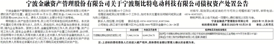 宁波金融资产管理股份有限公司拟对宁波斯比特电动科技有限公司单户债权资产进行处置。截至2023年10月31日,债权本金:7,948,110.54元,利息及罚息等8,849,254.75元。债务人及担保人主要分布在宁波等地。