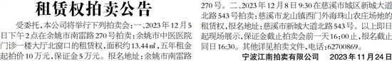 受委托,本公司将举行下列拍卖会:一、2023年12月5日下午2点在余姚市南雷路270号拍卖:余姚市中医医院门诊一楼大厅北窗口的租赁权,面积约13.44㎡,五年租金起拍价10万元,保证金5万元。报名地址:余姚市南雷路270号。二、2023年12月8日9:30在慈溪市城区新城大道北路543号拍卖:慈溪市龙山镇西门外海珠山农庄场地的租赁权,报名地址:慈溪市新城大道北路543号。以上即日起现场展示,保证金截止拍卖会前一天16:00止,报名截止同日16:30。其他详见拍卖文件,电话:62700869。