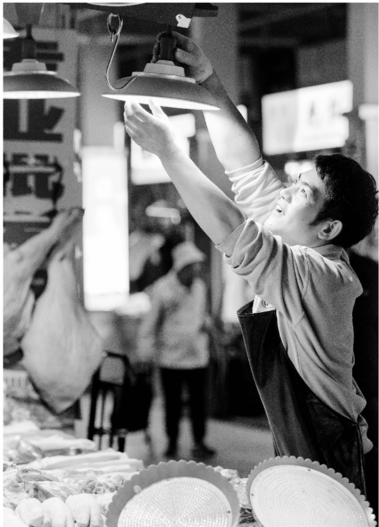 11月23日上午,杭州市拱墅区杨家农产品交易市场里,肉档的商户们把铺位里的“生鲜灯”换成白色日光灯。