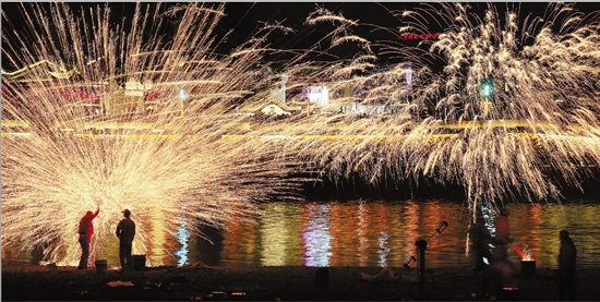 近日,一场传统非遗活动“打铁花”和3D灯光秀在义乌市佛堂镇义乌江畔上演,给千年佛堂古镇为期6天的十月十民俗文化交流盛会增添了一大亮点。据悉,“打铁花”是非物质文化遗产,已有千余年历史,民间艺人将滚烫的铁水打向空中,流光溢彩的铁花犹如一簇簇烟火绽放夜空。