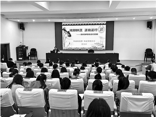 近日,在安吉县新录用公务员、选调生及新聘用事业人员初任培训班上,市反邪教协会秘书长开展了以“驱邪扶正,正信正行”为主题的反邪教专题授课,进一步提升学员识邪辨邪防邪能力。