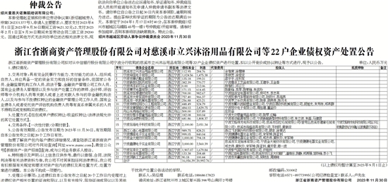 浙江省浙商资产管理股份有限公司拟对从中信银行股份有限公司宁波分行收购的慈溪市立兴沐浴用品有限公司等22户企业债权资产进行处置,拟以公开竞价或协议转让等方式进行,现予以公告。