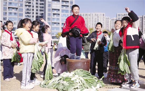 12月7日,大雪节气,杭州永正实验学校的操场上,500多名师生把3000多斤大白菜放入大缸,轮流用脚踩踏的方式腌制江浙一带颇为流行的冬腌菜。入冬腌制大白菜是该校的传统,接下来三周,他们还将对冬腌菜的变化作持续观察记录。 倪雁强 摄