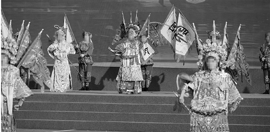 “穆桂英,穆桂英,桃花马上威风凛……”伴着铿锵有力的唱词,王小会扛着代表千军万马的大旗奔向舞台。